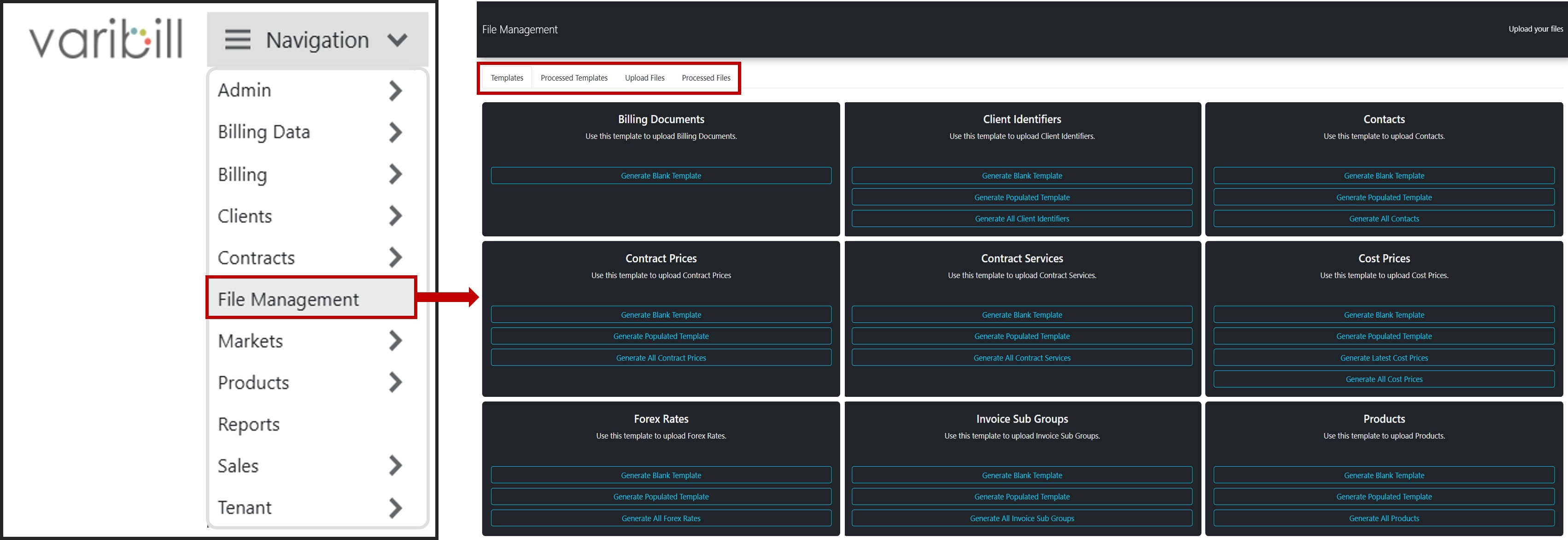 File Management is Varibill’s central workspace for preparing, uploading, and validating all file-based billing data. It provides a structured, template-driven workflow that ensures every record entering the Billing Engine is accurate, consistent, and aligned with your product, client, contract, and pricing configuration.