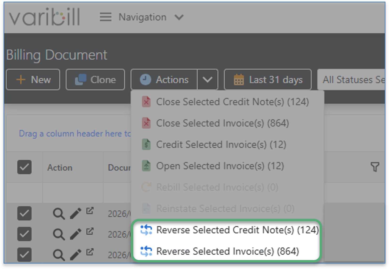 Use the Date Range filter to populate the grid with your list of Billing Documents. For example, Last 31 Days or Last 12 Months.